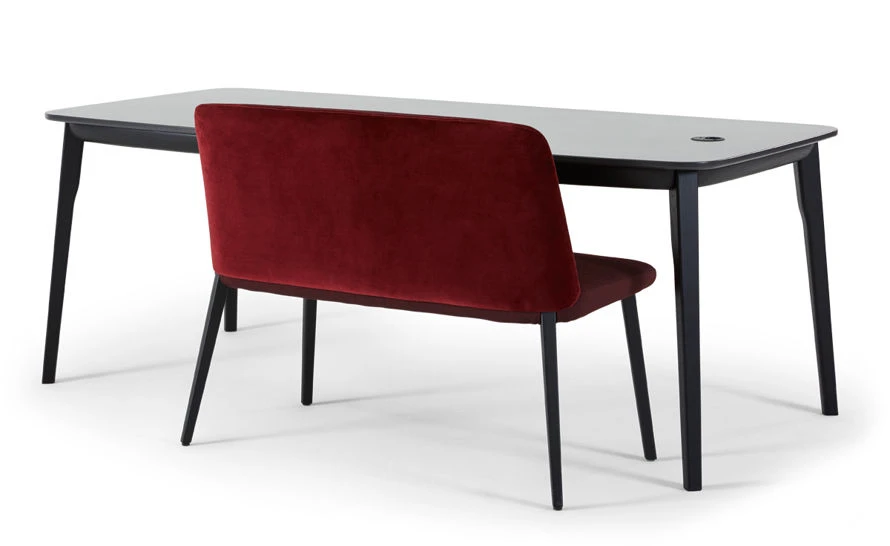 Back Me Up Two is offered in leather or fabric upholstery. The legs can be specified in walnut or oak. The collection also includes dining table and chairs. Back Me Up Two can also be upholstered with a different inside and outside fabric (please call to specify this version).