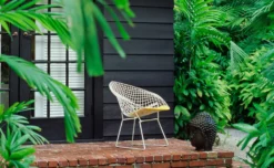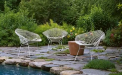 With proper care and limited exposure to the elements, the Bertoia Diamond Chair specified with with a white or black finish and vinyl upholstery, is appropriate for outdoor environments.