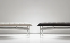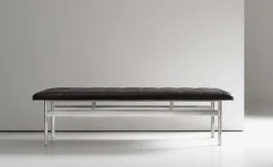 In 2012, the 82-year-old Charles Pollock introduced his first new product in America since the debut of his iconic Pollock Chair forty-seven years earlier. Likened by the iconic designer to a classic Jaguar sports car, the CP collection blends a sleek, aerodynamic stainless steel frame with a luxurious natural leather seat and exquisite craftsmanship to create a truly timeless functional piece of art. Bernhardt Design has introduced the CP1 bench to complement Pollock’s existing lounge chairs and tables.