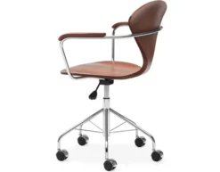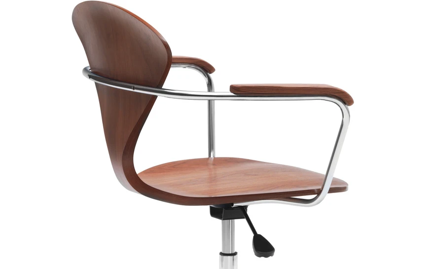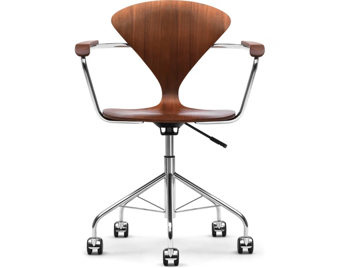 The new Cherner Task chair combines molded plywood and steel in a dramatic yet minimal design for the work environment. The spidery swivel base and curvaceous molded shell highlight the structural capabilities of the two materials. It is a further development of the classic molded plywood Cherner Chair. A strong, lightweight and graceful addition to the home or office, the Cherner task chair is available with or without armrests in all Cherner finishes and upholstery options.