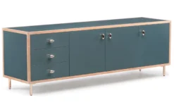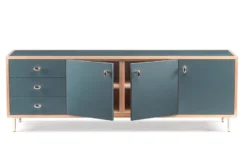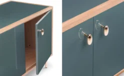 Classon Sideboard transcends time, its modern form featuring rich detailing that nods to a more traditional American aesthetic. Polished bronze drawer pulls and legs elegantly compliment the cabinet body. Available in American black walnut, American white oak, or European Ash in a range of finishes; with painted HDF in a choice of colors with a satin matte or gloss finish. The bottom panel includes holes for cable management. The sideboard is available in a choice of five different configurations to suit a variety of storage needs.
