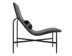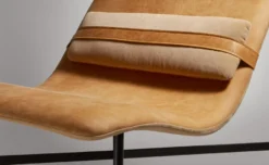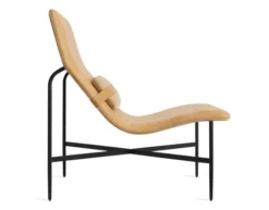 Freudian Slipper Chair. Leather wrapped contours form a relaxing position that equally invites introspection and socialization. The contrasting lumbar pillow slides to be where you want it and blackened steel base provides all the support needed to start your journey of taking a damn load off. Chaise lounge chair also available.