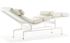 The Eames chaise features six 2.5″ cushions upholstered in your choice of leather. Two loose cushions give additional support for the neck, back, or legs. The gently sloping frame puts the body in a healthful relaxed position, with the head and legs slightly raised. A scratch-resistant coating is electrostatically applied to the frame (offered in three colors). With its thin lines, leather upholstery, and sculptural frame and base, the chaise is a contemporary work of art.