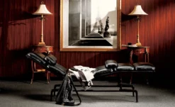 The chaise is soft, comfortable, and just 18 inches wide. When you lie on it, you naturally fold your arms over your chest. Should you doze off, your arms soon fall to your sides, waking you up. It’s a beautiful place to relax for a spell in a study, den, or executive office.