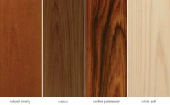 The chairs are offered in your choice of santos palisander, natural cherry, walnut, white ash or 2 stain colors. The red stain is on birch veneer, allowing the wood grain to show through; inner plies are visible. Ebony finish is stain on ash veneer; inner plies are not as visible. The lighter the stain, the more you’ll see of the grain. Chair is available with self-leveling nylon glides. Black base finish has black glides; trivalent chrome base finish has white glides. Santos Palisander has an exuberant grain pattern; this can become a significant design element and has the same characteristics as the original rosewood, color and grain.