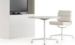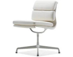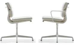 An extension of the Aluminum Group chairs designed in 1958 for the Irwin Miller home, the Soft Pad Group repeats the structure of the earlier chairs, adding cushions to the seat and back. Covered in leather or fabric, these cushions transformed the spare character of the Aluminum Group into a luxurious version for homes and offices.