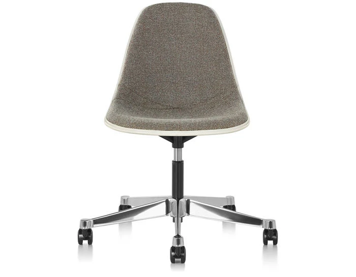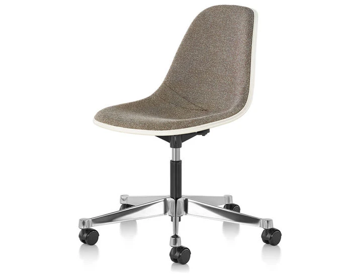 The Eames Task chair is an extension of the existing Eames Shell Chair Family, offering select shell and upholstery combinations on a five-star base. The arm shells are a single-piece molded plastic or fiberglass shell with waterfall edges and available upholstery options. Shell color and upholstery options mirror the existing Eames Molded Plastic and Fiberglass Arm Chair portfolio. Upholstery with textiles or leather for indoor use only.