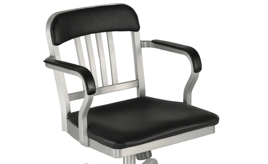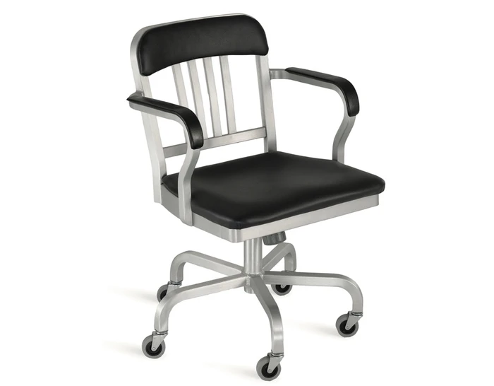 The Navy Swivel arm chair is upholstered in Spinneybeck Volo Leather (black) and offers swivel/tilt, tension and pneumatic height adjustment.