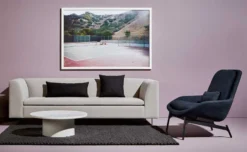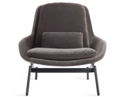 Shapely curves, a gentle recline and “just-right’ cushions invite the lost art of unwinding. A sculptural powder-coated steel base sets up the striking profile. Optional Field Ottoman is also available.