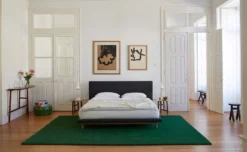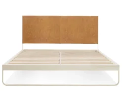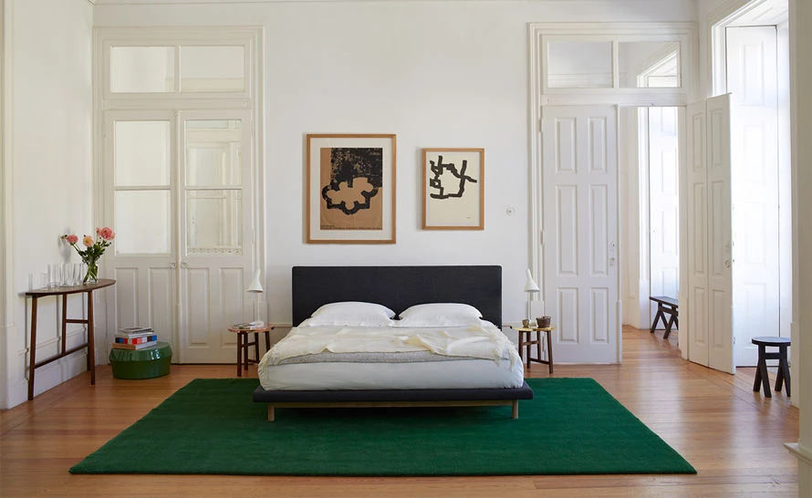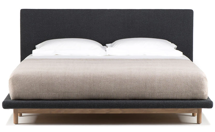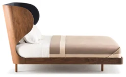 Available in American black walnut, American white oak, or European Ash in a range of finishes, and a range of fabrics. Bed base consists of several individual timber slats, set approximately 5cm (2″) apart. Please note that when using leather to upholster the expansive surface of the headboard, the De la Espada craftspeople will use their discretion to ensure the natural variations in the hide’s color and grain are most elegantly displayed. This may mean adding stitch lines to the headboard. Also available in King & California King size options.