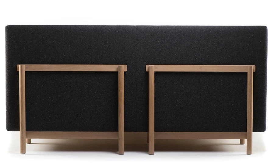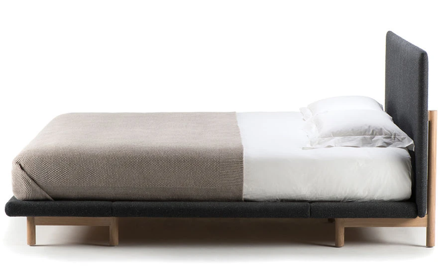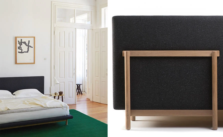 Frame is an upholstered bed supported by a wooden frame structure to which various accessories can be clipped, such as a tray or light. Designed by neri&hu and manufactured by De La Espada for the neri&hu brand.