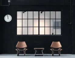 Due to the complexity of the chair’s design, only around 300 copies were originally produced. Only a few remain in existence today. Lange Production was chosen and authorized to launch the furniture in two wood finishes, walnut and black stained ash wood.