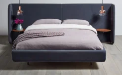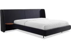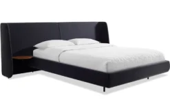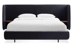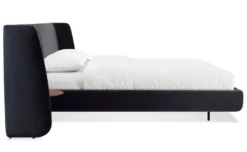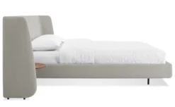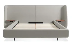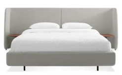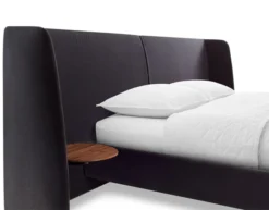 Surround yourself in serenity with Hunker. Built-in walnut nightstands are integrated into an enveloping curved upholstered headboard providing a safe space for all your nocturnal endeavors. Available in queen or king sizes. Mattress and bedding not included.