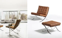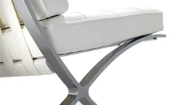 Created by Ludwig Mies van der Rohe for the German Pavilion at the 1929 Barcelona Exposition, the Barcelona chair features the pure compositional structure that now epitomizes Modern architecture. From the hand-buffed stainless steel or chromed frame to the individual leather squares carefully welted together, each Barcelona chair is a tribute to traditional craftsmanship and meticulous attention to detail. Knoll is the only authorized and licensed manufacturer of the Barcelona Collection since 1953. Mies van der Rohe’s signature is stamped into the frame of each piece to guarantee authenticity. Knoll has received trademark protection for the designs created by Mies van der Rohe, a Barcelona chair not manufactured by Knoll is a counterfeit.