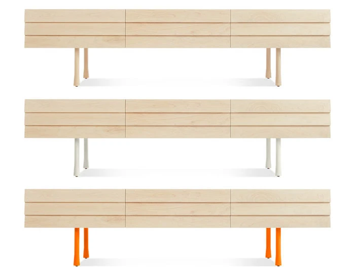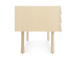 The Long and Low features a center flip-down door flanked by two drawers. It features a solid whitewashed maple top and door/drawer fronts. The drawers have self-closing hardware for smooth & silent closure with cable management openings in the back and adjustable shelves. The orange and white leg finish options are powder-coated steel plate and the maple legs are solid white washed maple. Unfinished wood back.