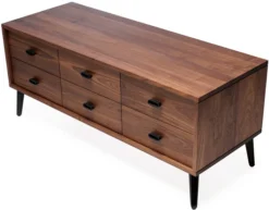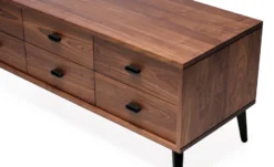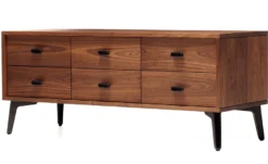McQueen low chest is available in American black walnut, American white oak, or European Ash in a range of finishes; with drawer handles and legs of cast iron. Mcqueen is also available in various sizes and configurations.