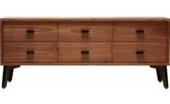 McQueen low chest is available in American black walnut, American white oak, or European Ash in a range of finishes; with drawer handles and legs of cast iron. Mcqueen is also available in various sizes and configurations.