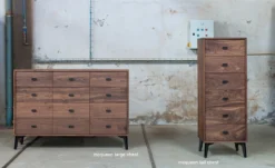 McQueen tall chest is available in American black walnut, American white oak, or European Ash in a range of finishes; with drawer handles and legs of cast iron. Mcqueen is also available in various sizes and configurations.