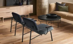 Ink Leather: An aniline leather with a soft matte finish and velvety feel; Variation in the natural leather becomes more beautiful with use; Leather seat with coordinating ink velvet chair back