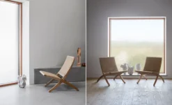 A light and flexible folding chair, MG501 Cuba Chair fits well into any room. It’s easy to fold up or hang on the wall and can be stored in a floor stand. The girth of the seat and back provide excellent support and comfort. MG501 is offered in a variety of wood finish and cotton webbing options.