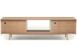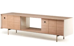 Available in American black walnut, American white oak, or European Ash in a range of finishes. Mirror-polished lacquered HDF frame available in a full range of colors. One internal storage box in black dyed wood composite with an oil and wax finish. Four sliding doors (two on each side). Burnished brass detailing.
