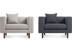 Streamline simplicity. One cushion, one color, one throw pillow – all dreamy. Solid wood legs are painted to match the upholstery. Available in three monochromatic finishes. Rostenkowski Blue, Packwood Grey and Makada ochre with legs painted to match. Spitzer Grey features walnut legs.