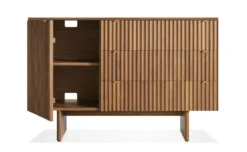 Murmur puts refined elegance front and center. Fluted wood creates a continuous pattern of textural delight. Small sandcast brass pulls nest in the grooves for subtle sophistication. Convex legs and soft-close drawers complete the pretty picture. Available in a bedside table, credenza, dresser, and console.