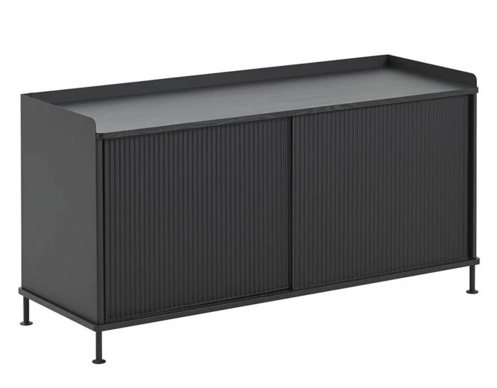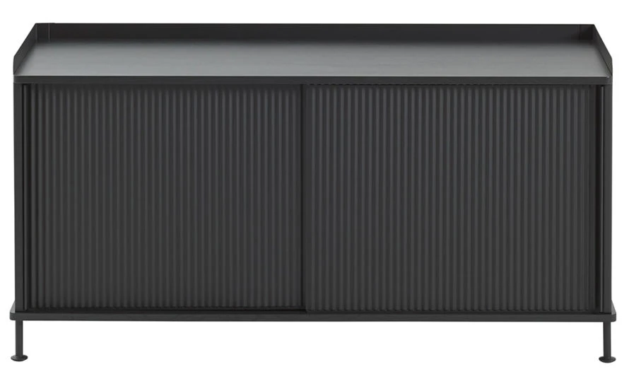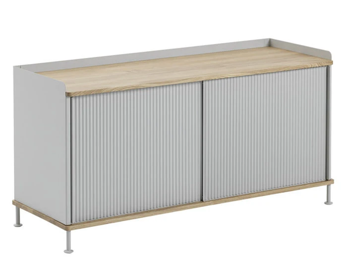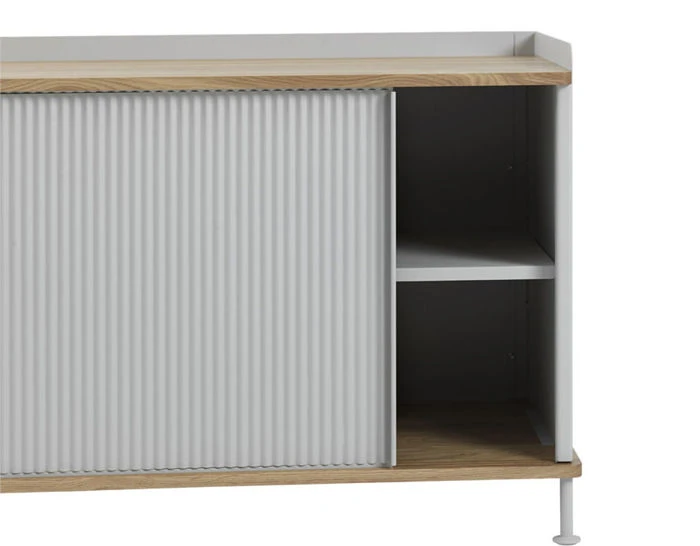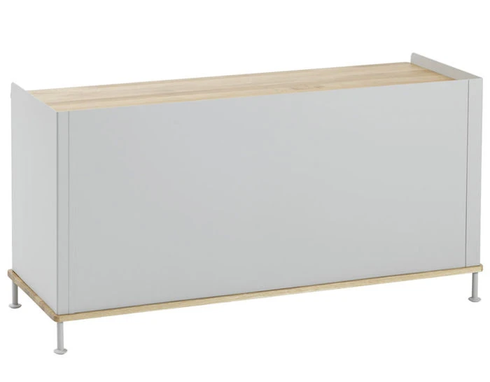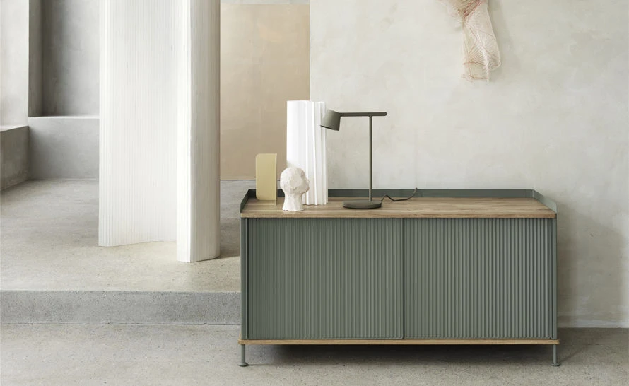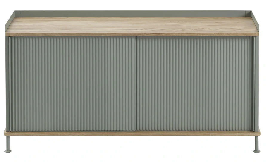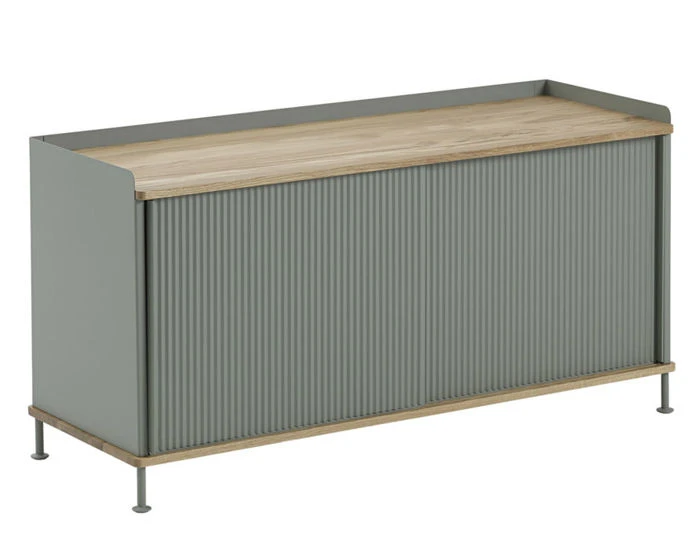 The Enfold sideboard features body, shelves and sliding doors in lacquered, bent steel. Top and base in solid oak.