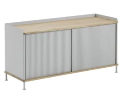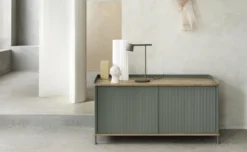 “Enfold Sideboard came from the many factory visits that I do as a designer, prompting me to explore the aesthetic appeal of industrial objects. I wanted to translate this element into modern storage together with an appreciation of the Scandinavian design tradition. The Enfold Sideboard combines the warm touch of oak, referencing the wooden sideboards of the 20th century, with the contemporary expression of its ridged steel front, softening up the cold material and binding it together with the sideboard’s oak components. The design is a new perspective on the traditional sideboard with an elegant and simple look, complemented by a unique duality of materials.” -Thomas Bentzen