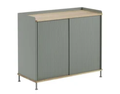 The Enfold sideboard features body, shelves and sliding doors in lacquered, bent steel. Top and base in clear lacquered solid oak.