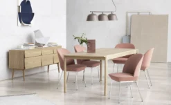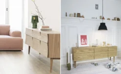 The Reflect sideboard features board with veneer in oak and solid oak legs offered with a natural oak or black finish.