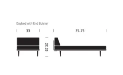 The Daybed with end bolster is available with either a walnut or white ash frame. The legs can be specified in either a hairpin metal with satin chrome finish or wood tapered in walnut or white ash to match the frame. The cushions can be upholstered in a variety of options. Ships ready to assemble.