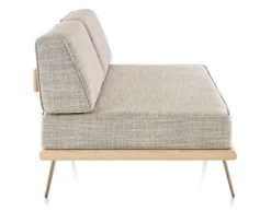 The Daybed with two bolsters is available with either a walnut or white ash frame. The legs can be specified in either a hairpin metal with satin chrome finish or wood tapered in walnut or white ash to match the frame. The cushions can be upholstered in a variety of options. Ships ready to assemble.