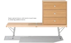 All of these cabinets are available without legs, so they can be stacked atop each other or the platform bench, or with legs, for freestanding use. Legs are 5.5″ high, black-finished, solid wood. Cabinets are available in two finish options-light brown walnut or natural oak. Drawer and door pulls are custom aluminum alloy.