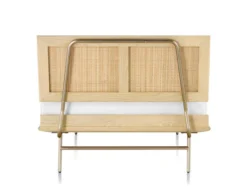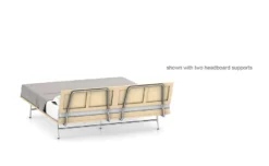 The Thin edge bed is available in a walnut or white ash frame with either a natural cane or veneer headboard. The legs can be specified with the original H-Frame style in satin chrome metal or tapered wood in walnut or white ash. Full, queen, king and california king beds have extra support legs for the center. Twin, full and queen sizes come with one headboard support, while king & California king options come with two headboard supports. Mattress & bedding not included. Ships ready to assemble.