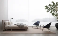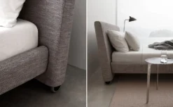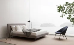Onto is an upholstered bed with a deceptively simple look. The sleek profile of the Onto features a tall, cushioned headboard that is angled for sitting up in bed. Recessed steel legs at the foot of the bed prevent toe stubbing and castors underneath the headboard allow for easy movement for cleaning or repositioning in the room.