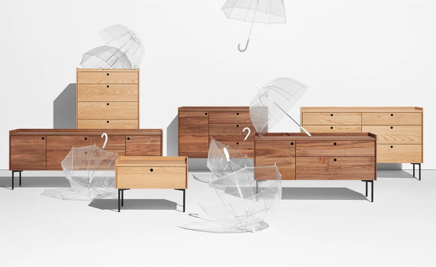 What is missing makes the mojo in this new wood case good collection. A round cut out in drawer and door front acts as the pull, the elimination of material creating function and visual appeal. Designed in a slew of shapes to see to storage needs in the bedroom, living room and dining room.