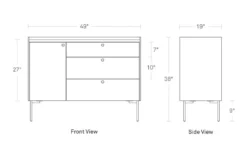 49″ w | 19″ d | 38″ h | legs: 9″ h | cabinet: 27″ h | top drawer: 7″ h | bottom drawers: 10″ h