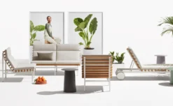 Rectangular teak slats and a matte white or grey aluminum frame cut a stylish and airy swath, whether it be the Riviera or the suburbs of Reno. Perch makes every day look like vacation. Beautiful to behold from the back side, the side side or the front side, the collection is made lounge-worthy with cushions covered in mildew and fade resistant Sunbrella fabric.