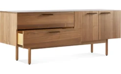 Beautility! The Shale collection offers layers of clean details. Solid wood and full grain leather pulls add storage panache and practicality to the bedroom, living room or dining room. Door units feature adjustable shelves and wire management holes.