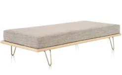 Companions bed is Available in American black walnut, American white oak, or European Ash in a range of finishes. Copper feet. Bed base consists of several individual timber slats, set approximately 5cm (2″) apart. Mattress & bedding not included. Assembly required.