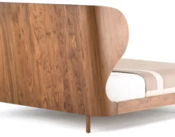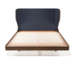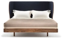 Available in American black walnut, American white oak, or European Ash in a range of finishes, and a range of fabric and leather options. Bed base consists of several individual timber slats, set approximately 5cm (2″) apart. Please note that when using leather to upholster the expansive surface of the headboard, De la Espada craftspeople will use their discretion to ensure the natural variations in the hide’s color and grain are most elegantly displayed. This may mean adding stitch lines to the headboard. Mattress & bedding not included.
