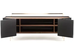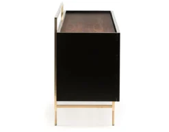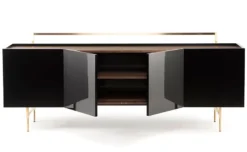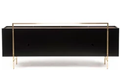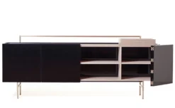 Exterior: Available in lacquered HDF polished by hand to a mirror shine in black RAL 9005, white RAL 9016, or bone NCS S1005-Y20R. Interior: Available in American black walnut, American white oak, or European Ash in a range of finishes. Legs and frame in brushed brass. Internal: three compartments, each with an adjustable shelf. One solid wood storage box included. NOTE 1: Shelves end 6.5cm (2 1/2″) from the back panel, to allow the passage of cables when used for audio visual equipment. Two holes in the back panel are also for cable management. NOTE 2: This product is on a longer manufacturing lead time than standard.