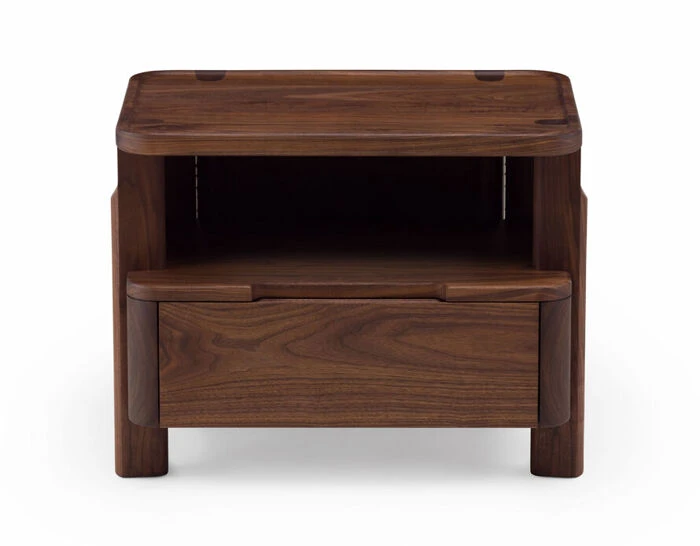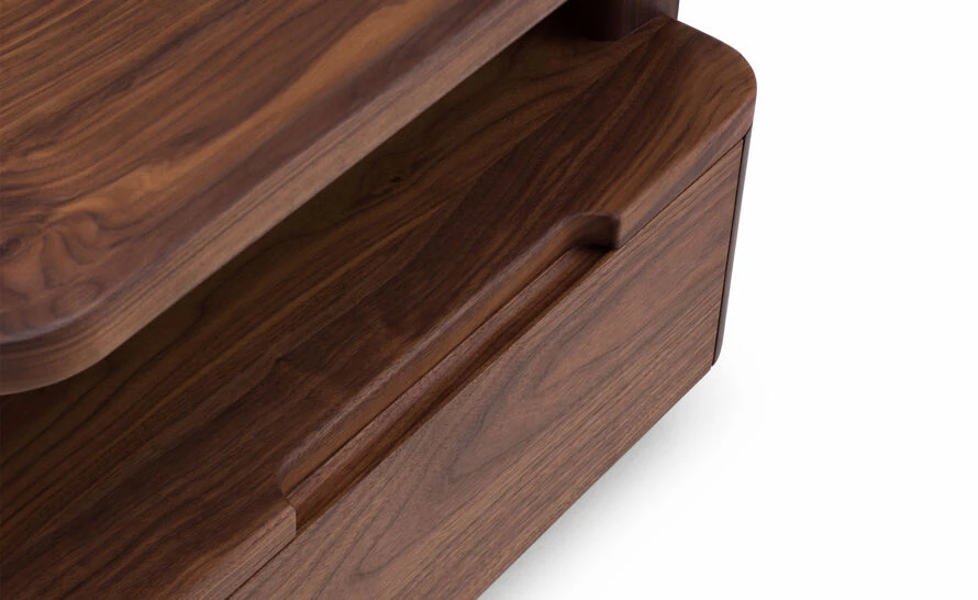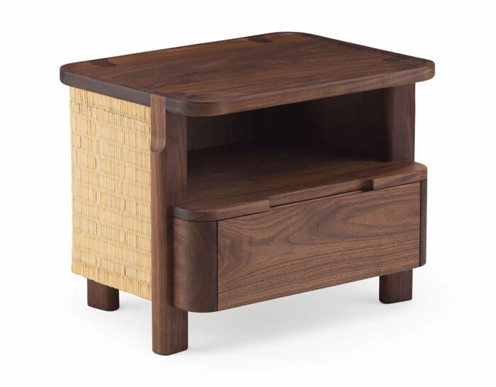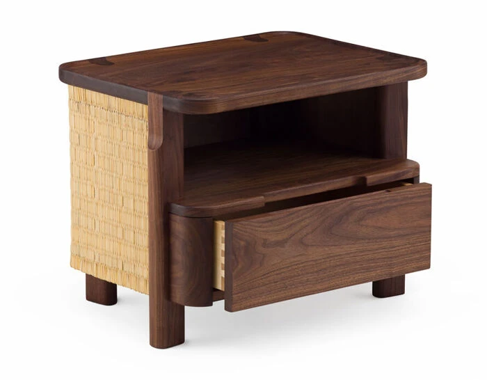 Offering generous yet compact storage with cable management, the bedside chest has one shelf and one soft-close drawer. The drawer front features a recessed handle on top and bottom, hidden from view, to allow easy access to the drawer contents both when in and out of bed. Thoughtful detailing includes using magnets to hold the woven panels in place to allow easy access to the cable management compartment, the recess in the tabletop serving to prevent items from rolling off, and the understated yet complex joint where the leg meets the top.