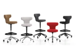 In addition to the Pivot High Stool, the tall model for working at stand-up desks, Pivot is available as a tall visitor chair in the version Pivot Counter Stool with a four-star base on glides, and also as a standard-height swivel chair in the studio version Pivot Stool.