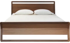Graceful lines meet gorgeous wood. Woodrow beds feature a combination of solid walnut and walnut veneer with wood slats. Available in walnut or white oak in your choice of four sizes (king, queen, full and twin). Mattress & bedding not included. Assembly required.